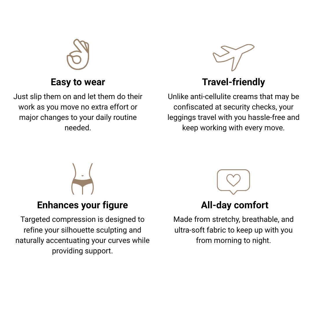The fabric hugs your body and applies gentle pressure on your legs. This soft compression promotes muscle tone and provides comfort and support all day long.